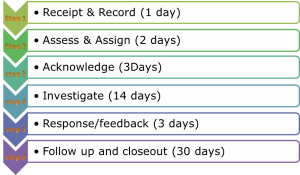 It involves receiving and registering complaints and continuously updating the register on remedial action taken. Complain receipt acknowledge will be done in writing, within 48 hours.